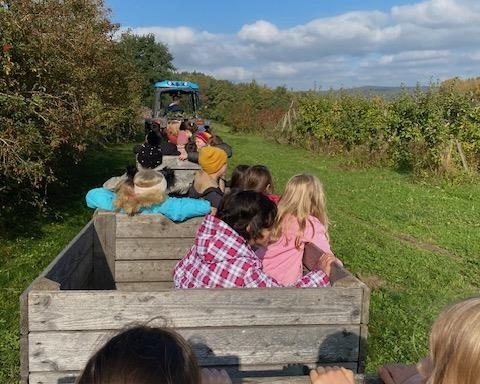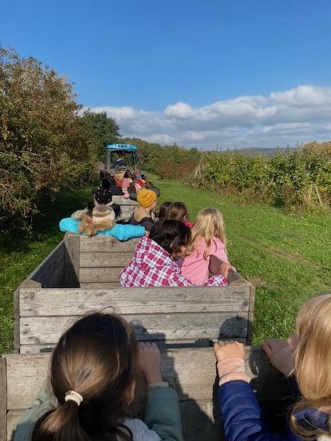 Nach einem kurzen Spaziergang kamen die Kinder gut gelaunt an und starteten mit einer kleinen Apfelkunde und Verkostung – besonders der Apfel mit pinkem Fruchtfleisch war schnell vergriffen! Im Anschluss wurde fleißig geerntet und dabei gelernt, wie wichtig der richtige Umgang mit dem Apfelstiel ist. Als Belohnung gab es frischen, selbstgepressten Apfelsaft aus unserer Produktion – natürlich aus eigenen Äpfeln. Zum Abschluss drehte der Traktorzug eine Runde durch die Plantage, was ein echtes Highlight für Groß und Klein war.