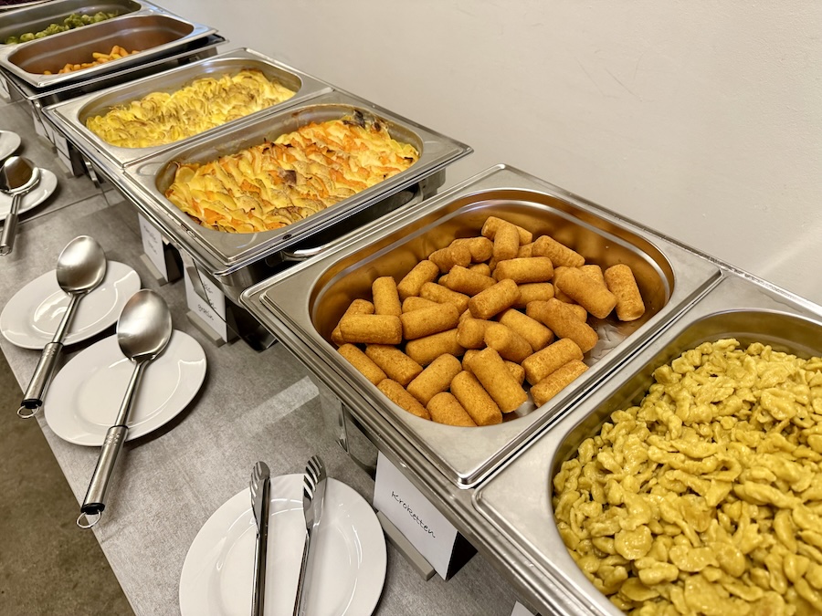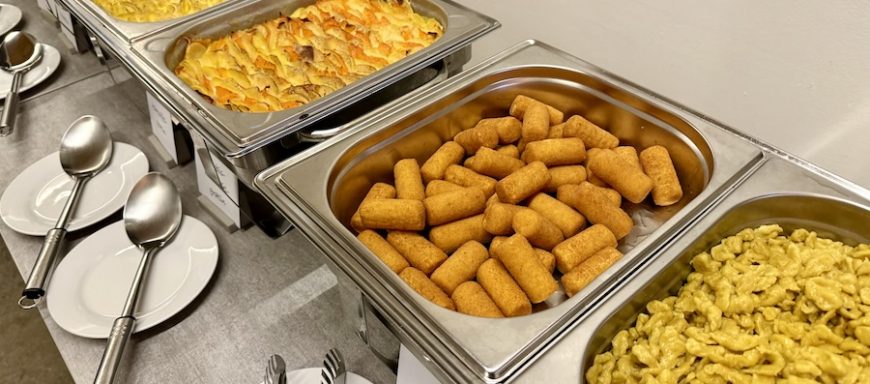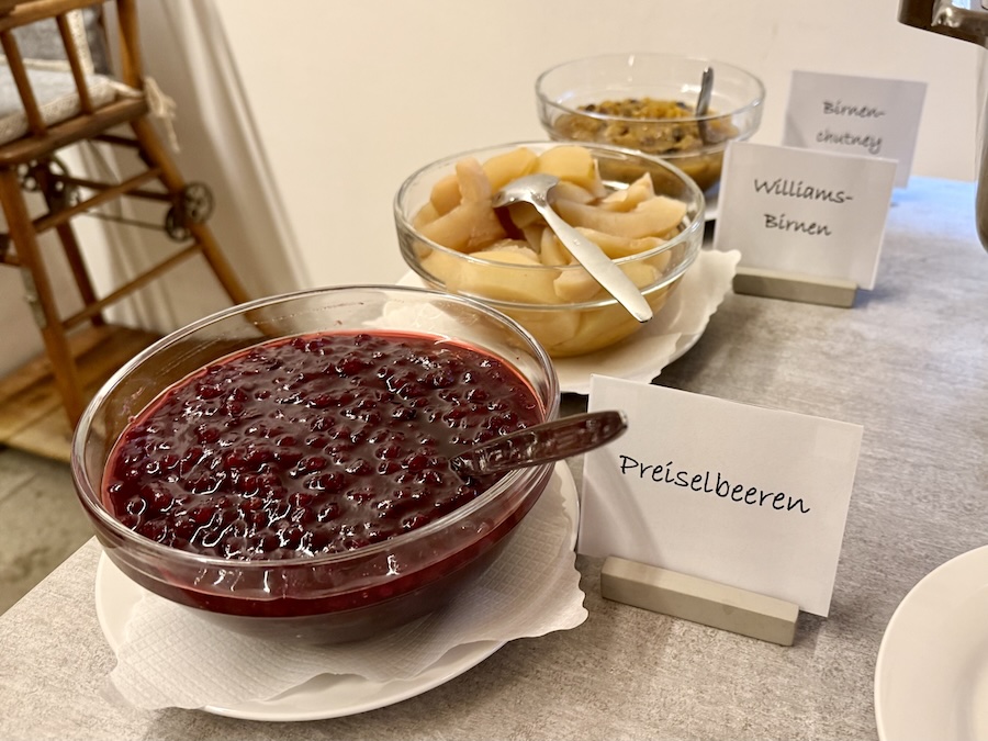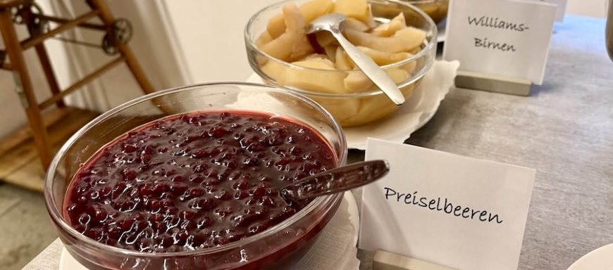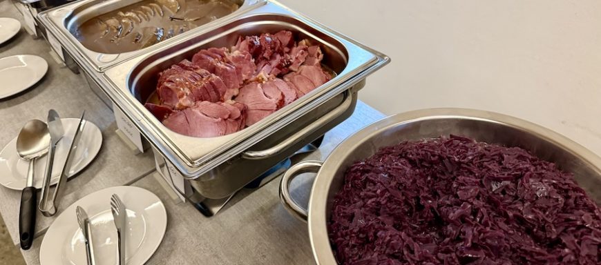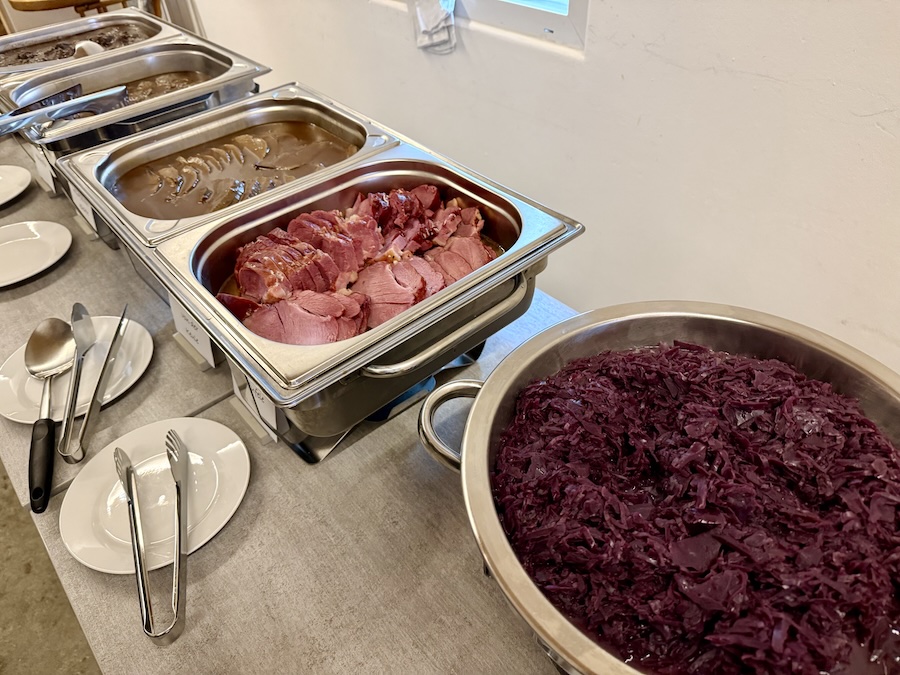 Beim Hauptgang wurde es dann richtig deftig und aromatisch: Zartes Hirschfleisch von der Keule, kräftiger Rehpfeffer und saftige Wildschweinküchle sorgten für Begeisterung. Dazu gab es feine Beilagen wie hausgemachte Spätzle, knusprige Kroketten, ein cremiges Kartoffel-Kürbis-Gratin sowie verschiedenes Herbstgemüse. Abgerundet wurde das Ganze mit Birnenchutney, Preiselbeeren und Williamsbirnen – ein Fest für alle Sinne!